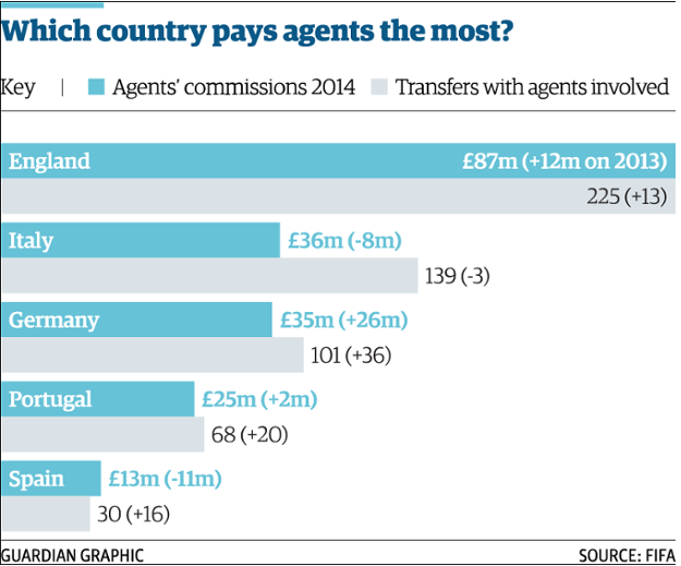 Vaikka espanjalaisseurat käyttivät viime vuonna toiseksi eniten rahaa kansainvälisiin siirtoihin, maassa maksettiin agenteille ainoastaan 13 miljoonaa dollaria palkkioita. Siinä missä Englannissa lukema kasvoi, Espanjassa summa putosi edellisvuoteen verrattuna lähes puoleen. Tämä siitäkin huolimatta, että Espanjassa agenttien kätilöimät siirrot lisääntyivät vuoteen 2013 verrattuna.