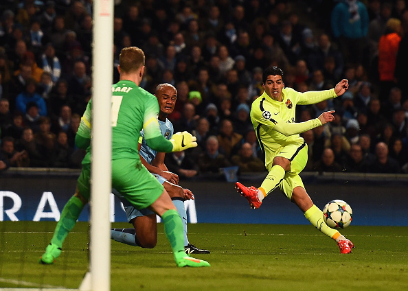 Barca iski johtomaalin 16. peliminuutilla. Messi nosti pallon maalille ja City-toppari Vincent Kompany ei onnistunut putsaamaan palloa pois maalintekosektorilta. Suárez poimi pallon ja laukoi pelivälineen City-maalin vasempaan alakulmaan.