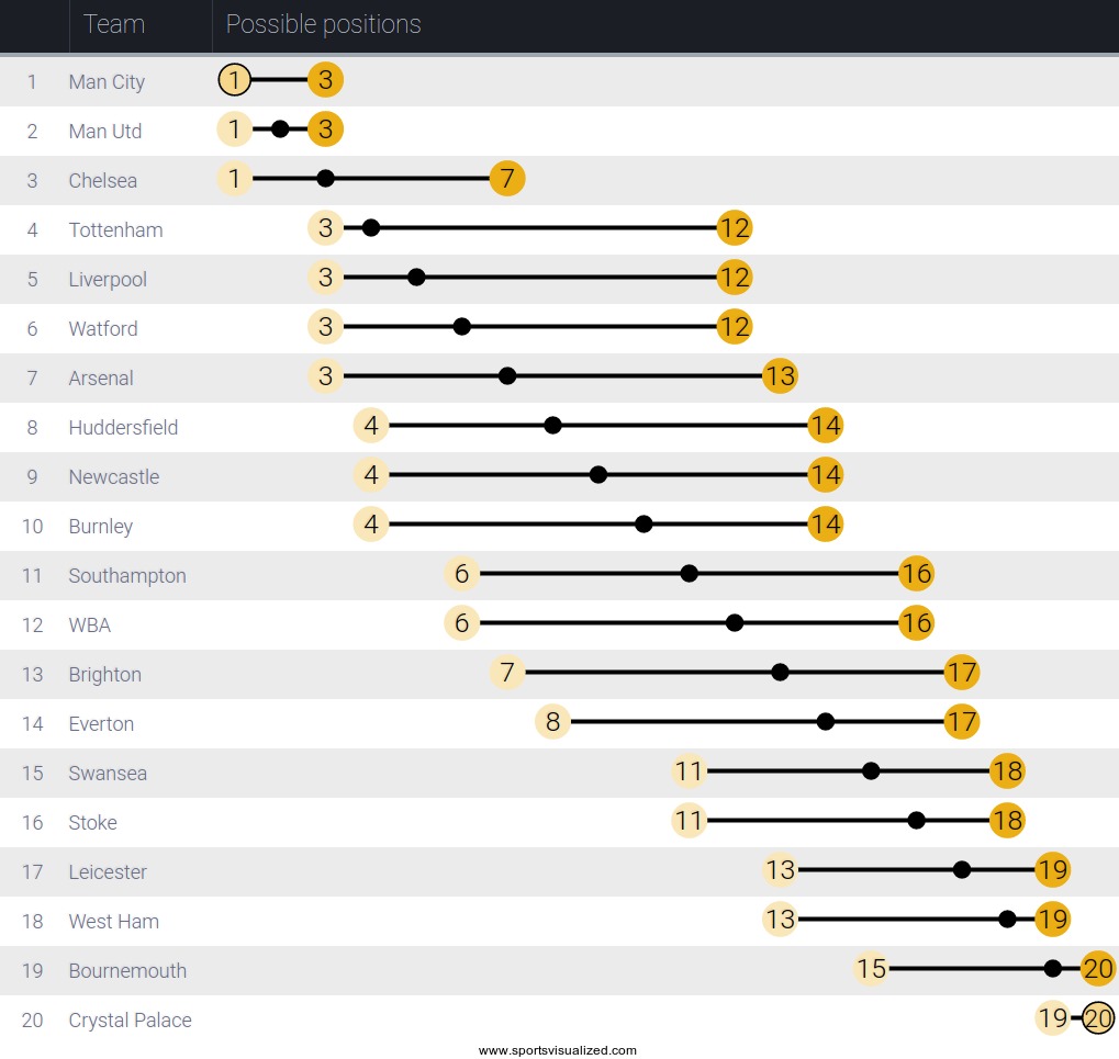 Alla olevasta taulukosta näette jokaisen valioliigajoukkueen tämän hetkisen sijoituksen ja samalla myös sen matemaattisesti mahdolliset sijoitukset seitsemännen kierroksen päätyttyä.