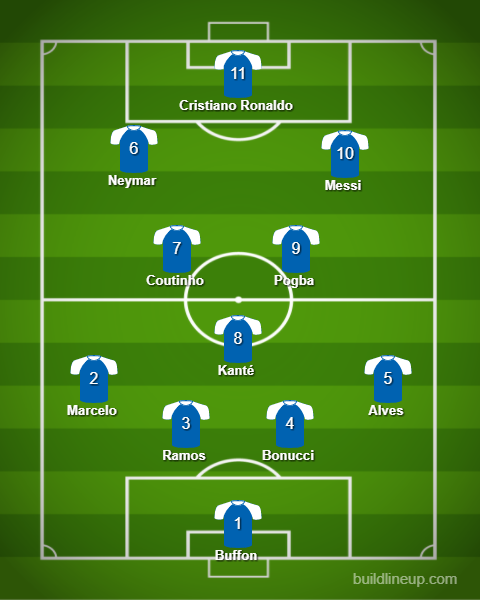 – Maaliin laitan Gigi Buffonin. Puolustuksen keskustassa minulla olisivat Sergio Ramos ja Leonardo Bonucci. Marcelo ja Dani Alves pelaisivat laitapakkeina. Keskikentällä: Paul Pogba, N’Golo Kanté ja Philippe Coutinho.
