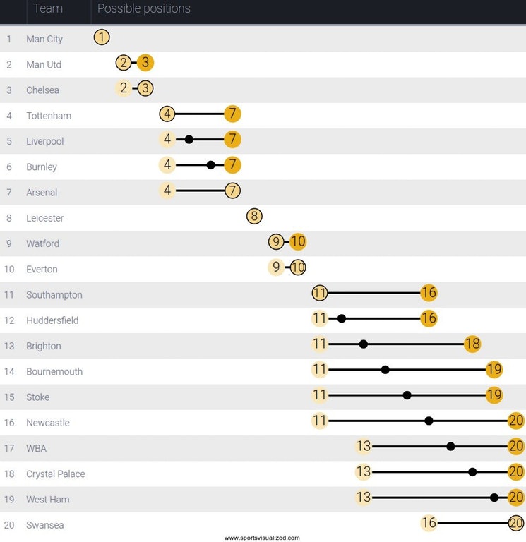 Varsinkin sarjan alemmalla puoliskolla erot ovat minimaaliset ja sijoitukset voivat muuttua todella paljon. Esimerkiksi Newcastle voi olla otteluiden jälkeen viimeisenä tai sijalla 11.