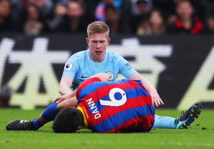 Vartin vaiheilla Scott Dann pysäytti Kevin De Bruynen läpisyöksyn, väänsi oman polvensa, sai varoituksen ja antoi Citylle vaarallisen vaparipaikan. Katastrofaaliset sekunnit Palace-kapteenille, jolla menossa oli juhlaottelu.